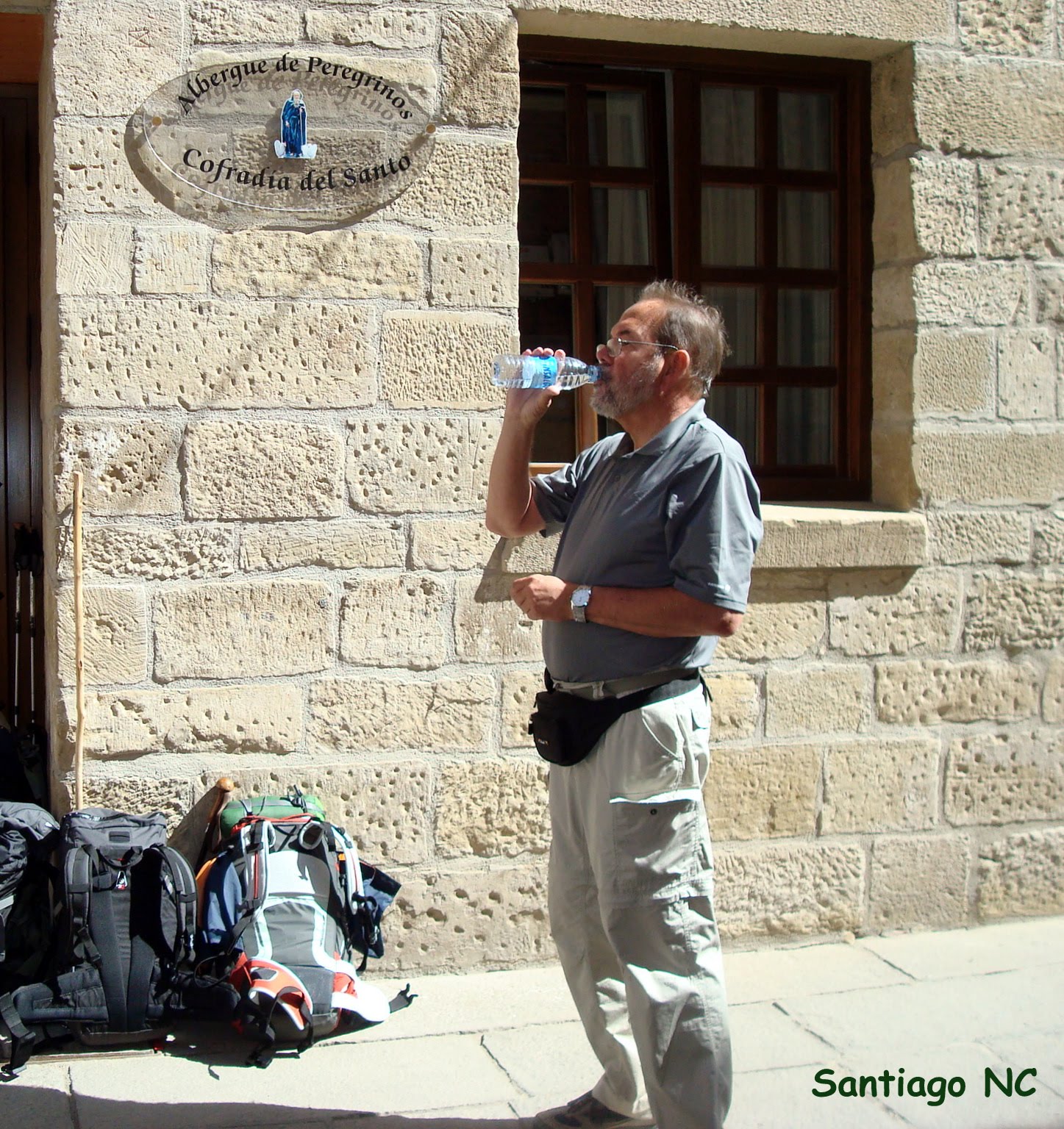 Al llegar dejamos nuestras mochilas haciendo cola, mientras nosotros descansamos. Yo me voy a un bar y me tomo un bitter con mucho hielo, hace mucho calor, pido también unas banderillas que comparto con mis colegas, a los que tengo que ir buscando pues se han acomodado a la sombra.